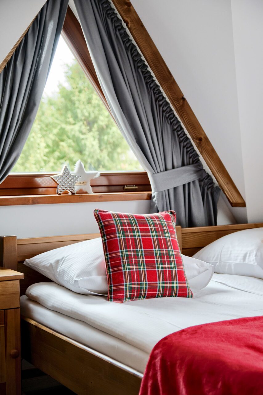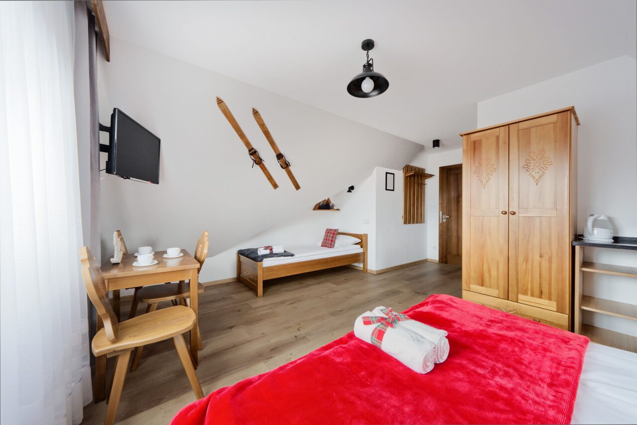 Przytulny, przestronny pokój trzyosobowy o powierzchni 24 m², zlokalizowany na poddaszu, stanowi doskonałe połączenie nowoczesności z lokalnym stylem. Pokój został zaprojektowany z myślą o zapewnieniu maksymalnego komfortu zarówno podczas odpoczynku, jak i codziennego użytkowania.