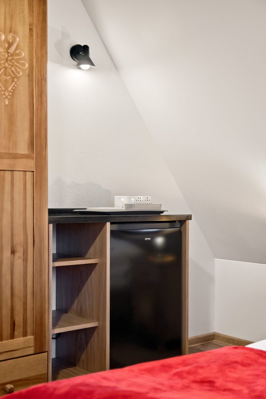 W pokoju znajduje się zabudowana lodówka z półkami oraz niewielkim blatem roboczym umożliwia przechowywanie żywności i przygotowywanie prostych posiłków. Na wyposażeniu znajdują się także: czajnik, talerzyki deserowe, sztućce oraz kubki na kawę i herbatę.