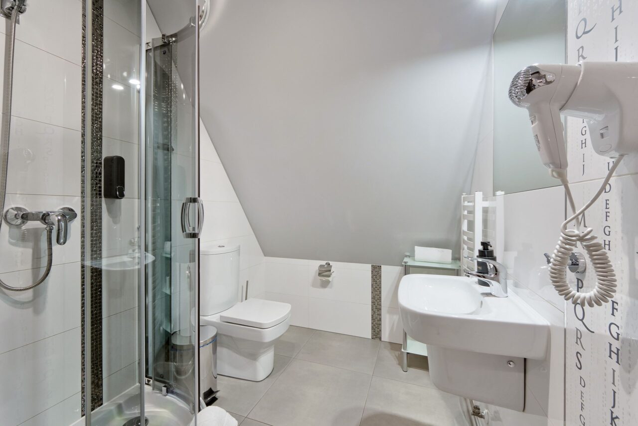 Łazienka jest w pełni wyposażona. Znajduje się w niej prysznic, toaleta, umywalka oraz dozowniki z płynem kąpielowym, szamponem i mydłem. Goście mogą również korzystać z ręczników oznakowanych logo naszego Domu Wypoczynkowego.